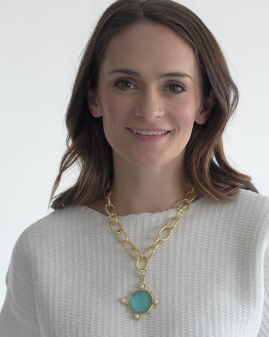 Aqua Venetian Glass Coin Intaglio and Genuine Freshwater Pearls on Chain Necklace