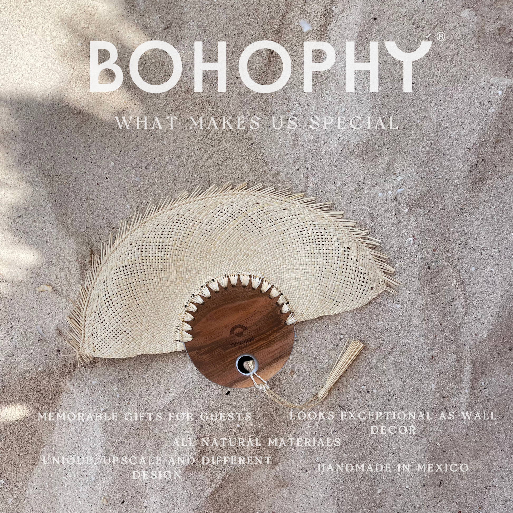 The Bohophy hand fan is made of natural straw and crafted manually, which generally can carry woven details, color shades, tassels, and size variations due to the handmade process. Please allow the magic of the handmade to take life.