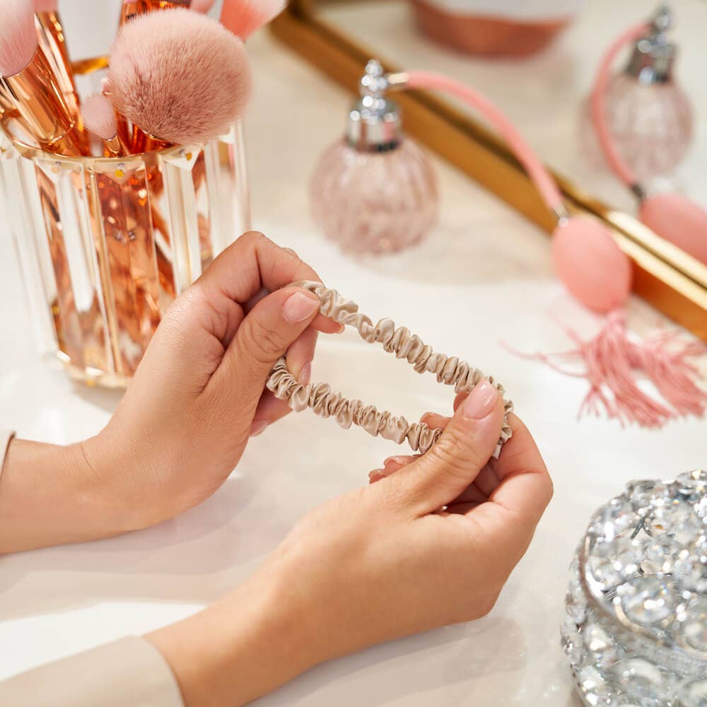 There’s nothing flat about this neutral. These champagne silk skinny scrunchies are bubbling with shimmering beauty! Make these a key piece in your accessory drawer.