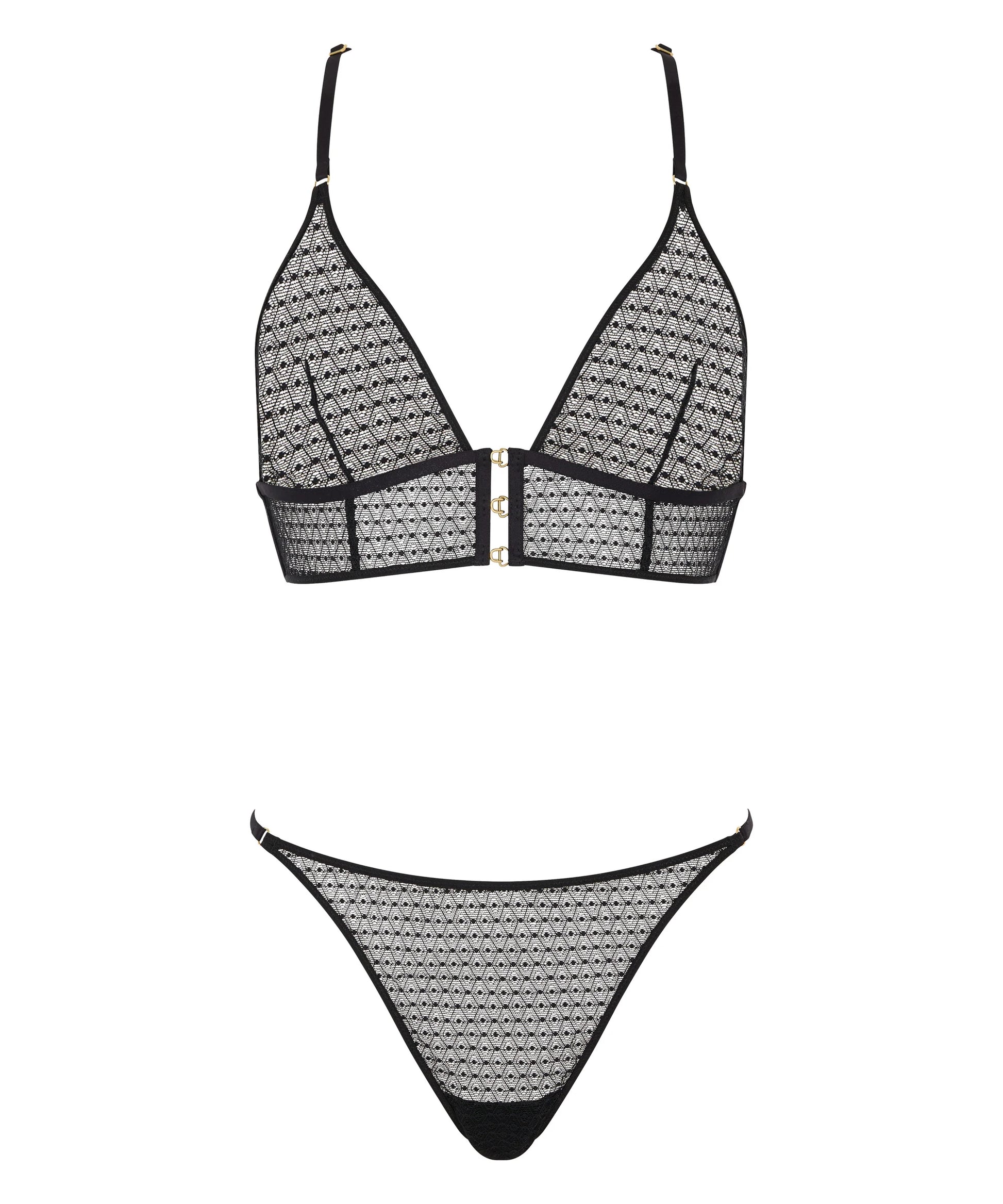 Combining patterned mesh with gold eyelets and suggestive lacing, Aubade's Secret Language set comprises two undeniably sensual pieces: a triangle bra with a plunging neckline, accentuated by a longline under band and a statuesque back, paired with a sexy tanga brief designed for zero VPL.