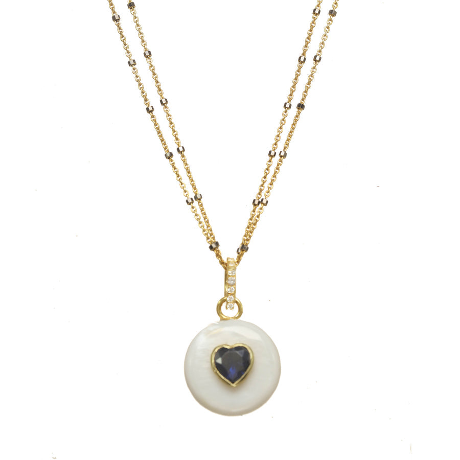 This elegant necklace showcases a charming heart bezel encased on a lustrous freshwater pearl, suspended gracefully from two strands of delicate handmade chain. The intricate dual-chain design adds a layer of sophistication and versatility, making it an ideal accessory for both everyday wear and special occasions. Elevate your style with this timeless and romantic piece.