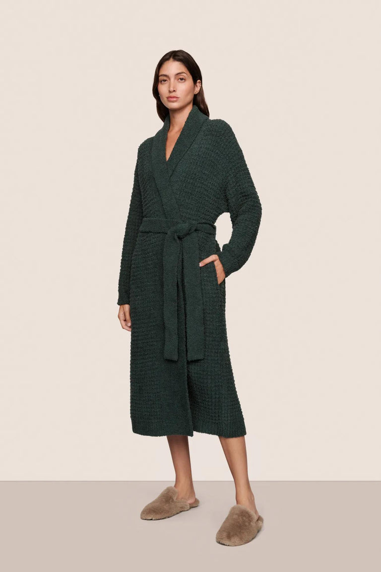 Layer on the cozy. Made from 100% post-consumer recycled polyester, this yarn is verified by OEKO-TEX® Standard 100, which means it was processed without harmful chemicals. Featuring a waffle bouclé texture, Eberjey’s mid-length robe is designed with a shawl collar, relaxed sleeves with rib trim at the shawl, cuffs, and hem, side seam pockets, and a removable tie belt.