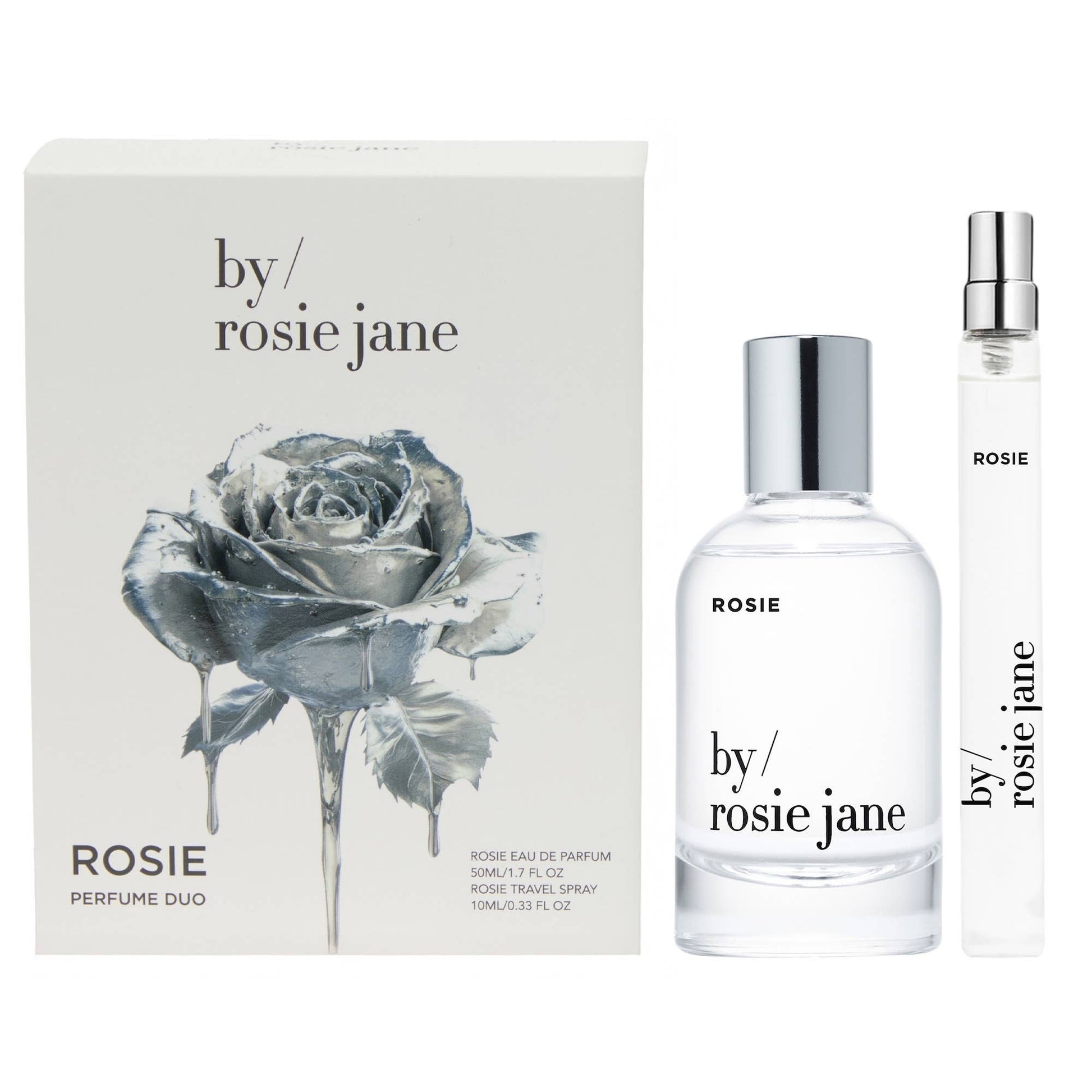 The perfect duo of By/rosie jane's best-selling ROSIE fragrance—one full-size bottle for your dresser and one travel spray for your purse. SMELL GOOD at home and on the go with this soft, warm perfume blend of white musk and a hint of pure rose oil.
