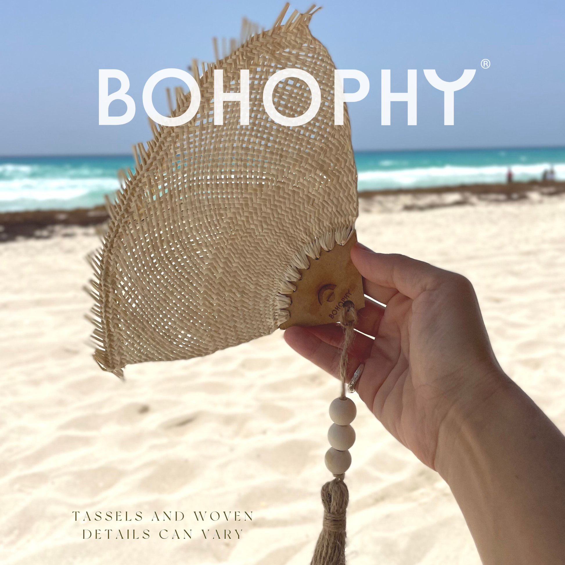 The Bohophy hand fan is made of natural straw and crafted manually, which generally can carry woven details, color shades, tassels, and size variations due to the handmade process. Please allow the magic of the handmade to take