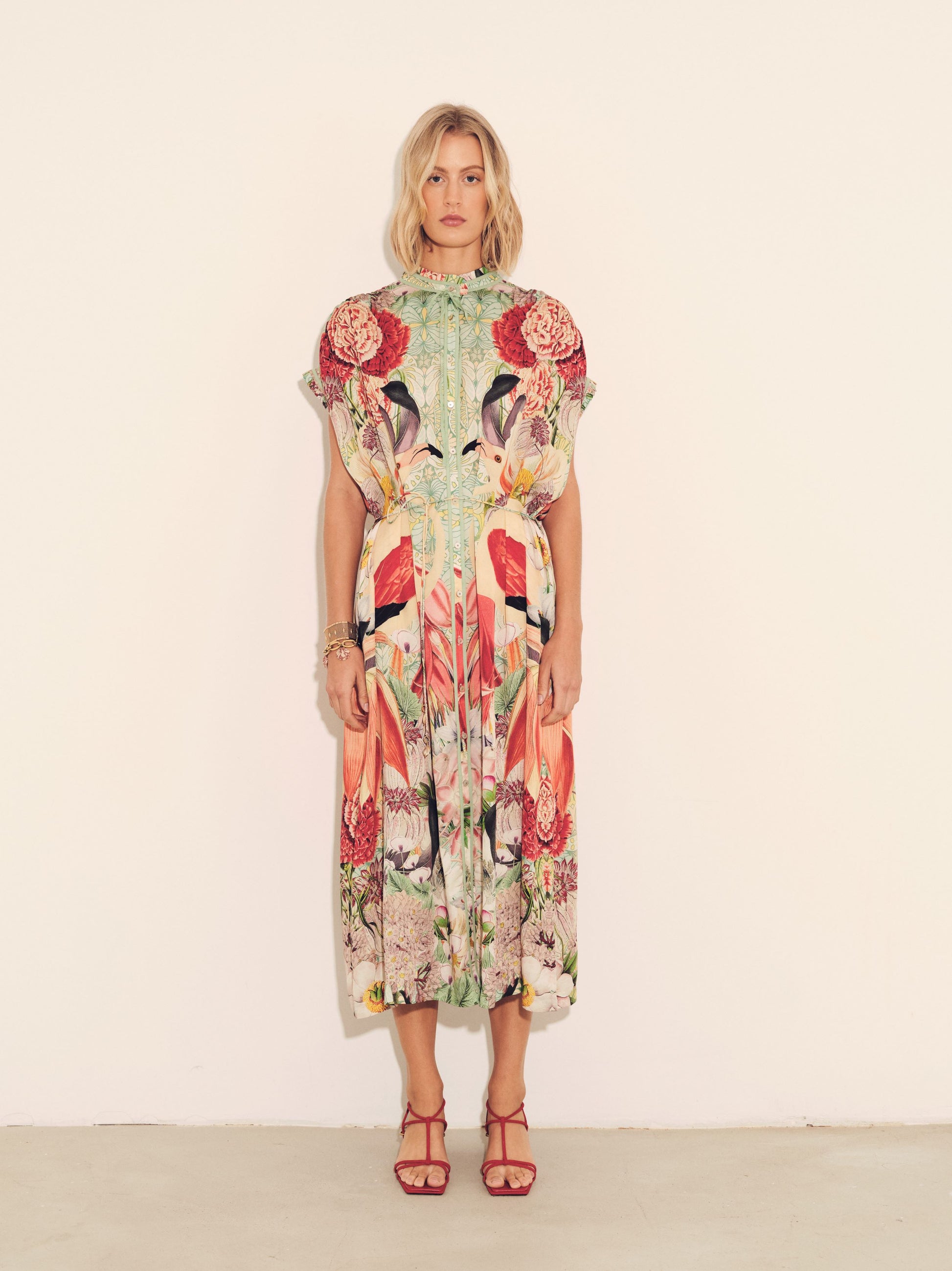 Carolina K's Valerie Kaftan in Flamingos is the perfect throw on piece to add to your carry-on. With the versatility to be dress up or down, this caftan features gorgeous embroidered detailing down the front, a curved hem, and front button closure. Pair with sandals and a tote for daytime wear or wedges and a clutch for tropical dinners