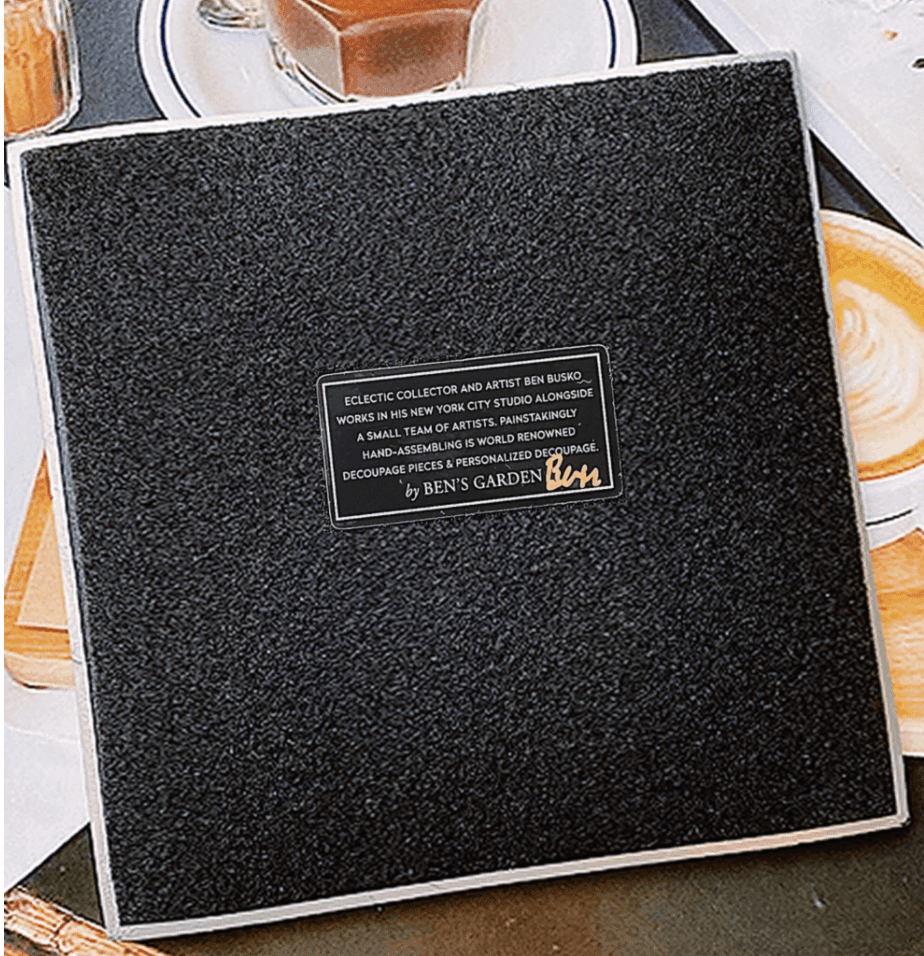 Handmade in his New York studio in the storied French tradition of decoupage, each tray is created with Ben’s signature eye for the poetic and the unexpected. The gently curved bent-glass form adds a sculptural elegance, while the reverse is felted for a smooth, protective finish. Each piece is individually signed by Ben — a quiet mark of authenticity and care.