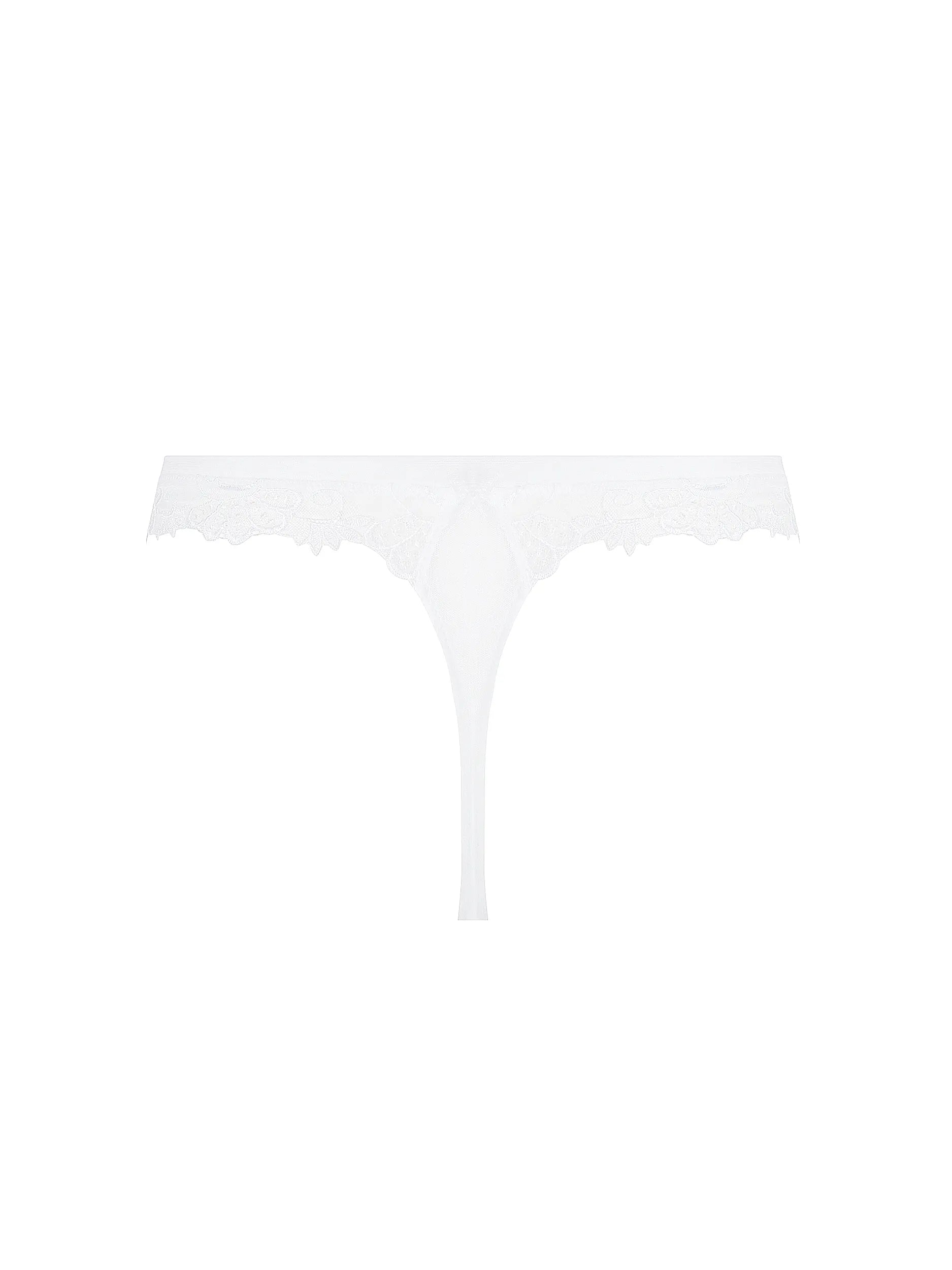 Lise Charmel's Tulle thong subtly reveals the cheeks. Tattoo-effect guipure insert . Delicate organza bow at center back.